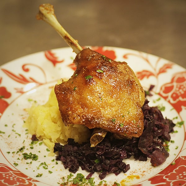Crispy Duck Leg with Onion Potatoes and Braised Cabbage